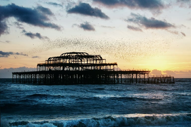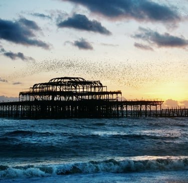 As a young man, strolling along the seafront in Brighton one Sunday afternoon, I discovered a group of eight drummers, huddled under the West Pier frantically warming their hands between bouts of high quality West African rhythms. Exceptional percussionists as they were, I joined them and we played together as the sun went down, watching the murmurations of starlings dancing over the pier. After that first encounter, I returned every Sunday, bar Christmas, for the next three years... and came to see that I was the only one who attended so religiously. One day, I remember saying to myself that I had found my church. At its peak, this spontaneous phenomenon attracted over 1000 people sprawled out over the beach. It was true magic.