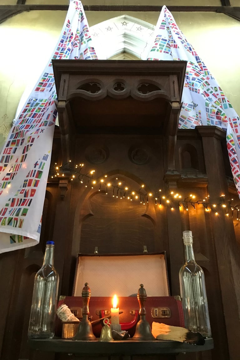 The water ritual takes place in the tower where the wonderful acoustics lend themselves so perfectly to singing. Whilst activating water through a magnetic vortex device... we sing/chant/sound using our voices to playfully join the structuring process.